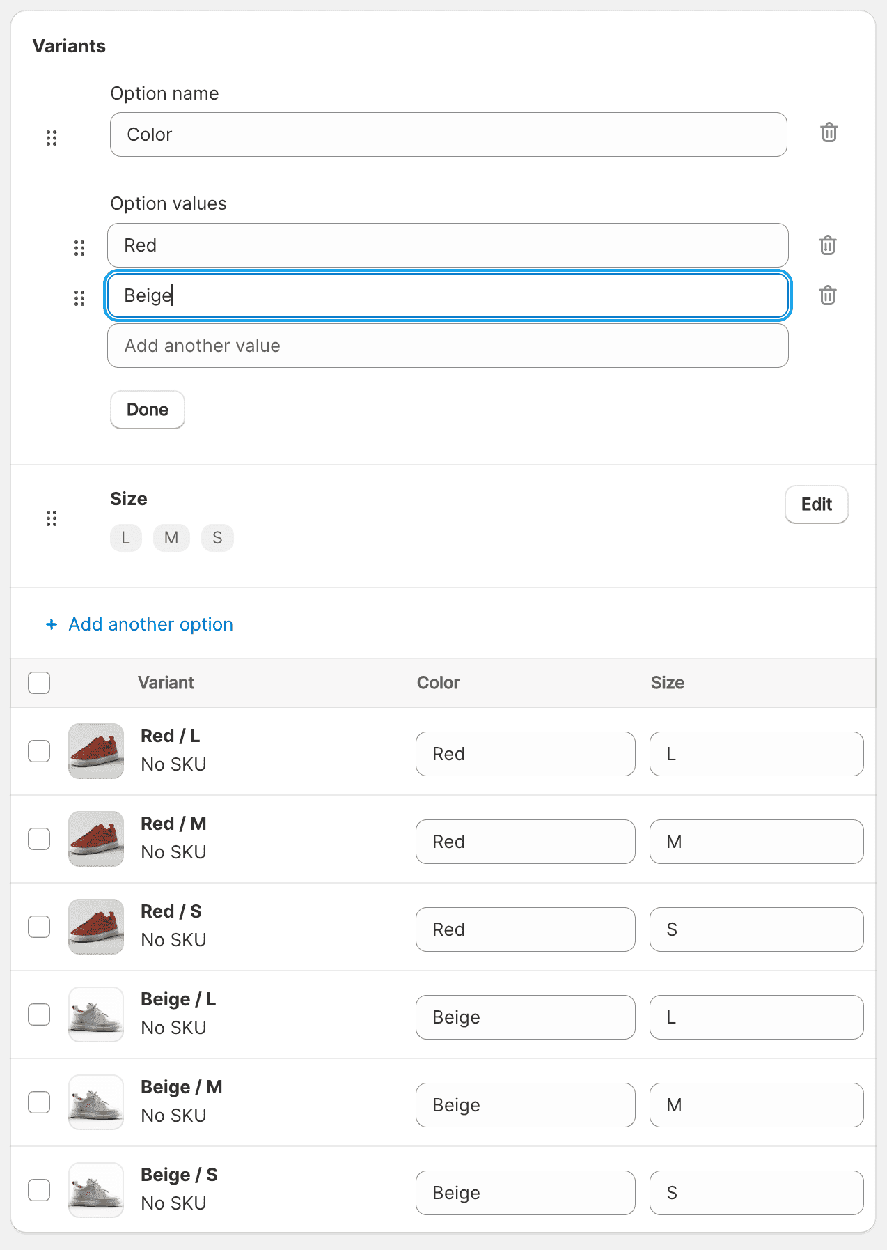 If your products only have the option “Size” and all the products have the same sizes like “S, M, L, XL,” then these sizes are considered duplicate option values. For example, if two different products both offer “Size: M,” Shopify treats these as duplicate option values.