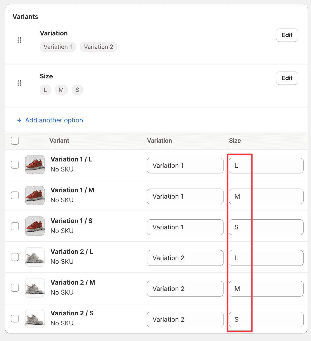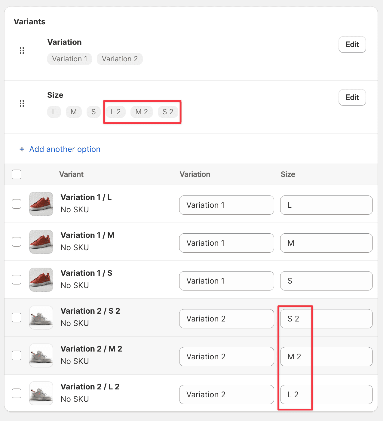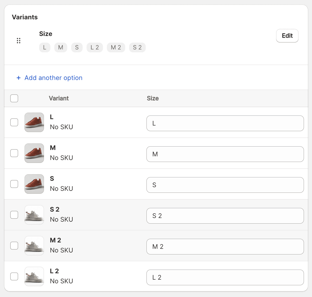 If your products only have the option “Size” and all the products have the same sizes like “S, M, L, XL,” then these sizes are considered duplicate option values. For example, if two different products both offer “Size: M,” Shopify treats these as duplicate option values.