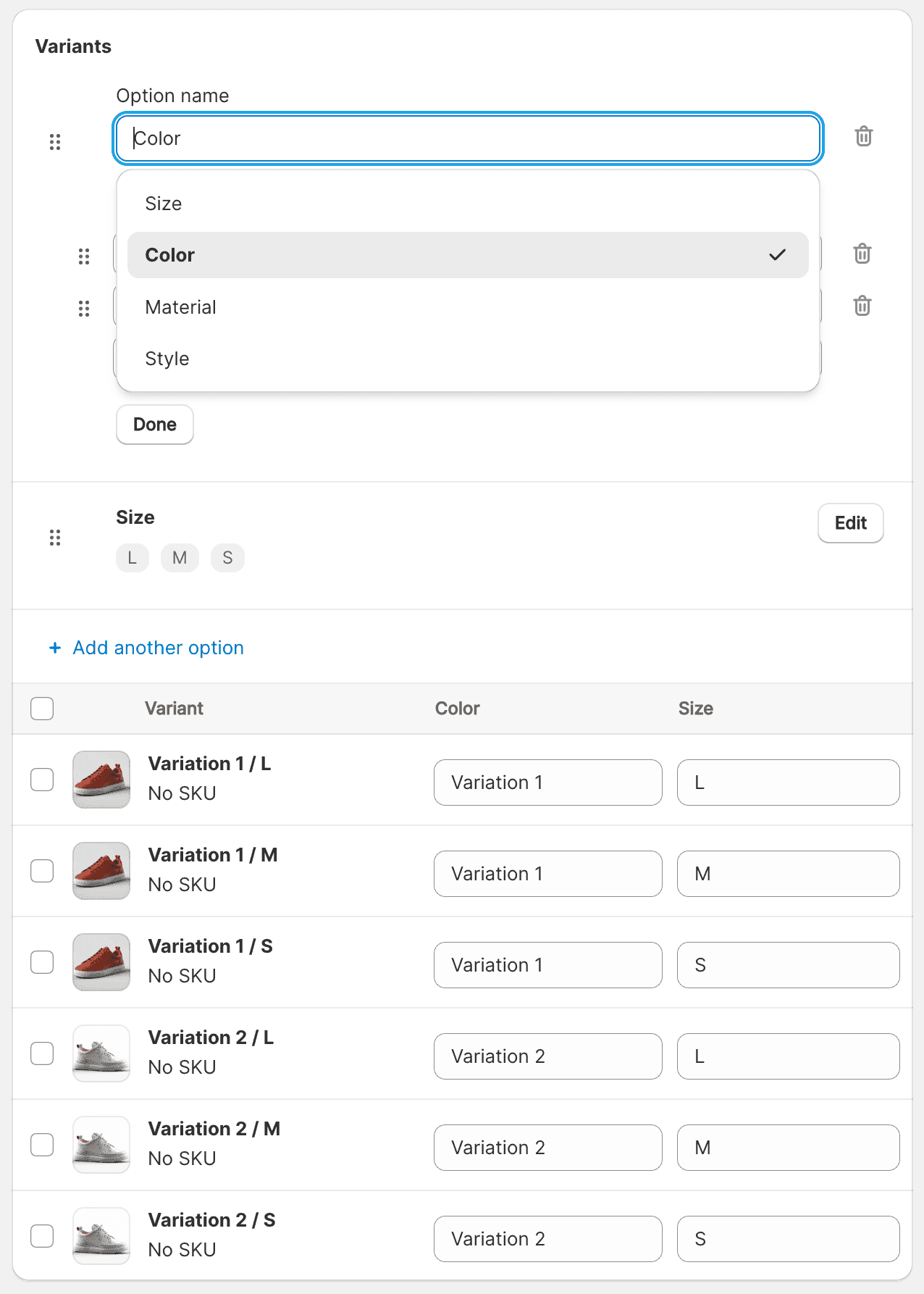 - Change the “Variant” option and its values to whatever you see fit.