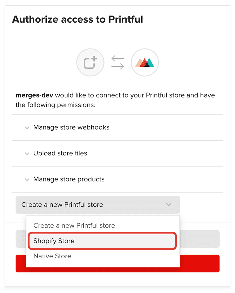- On the Printful authorization page, find the dropdown menu labeled ”Create a new Printful store”.